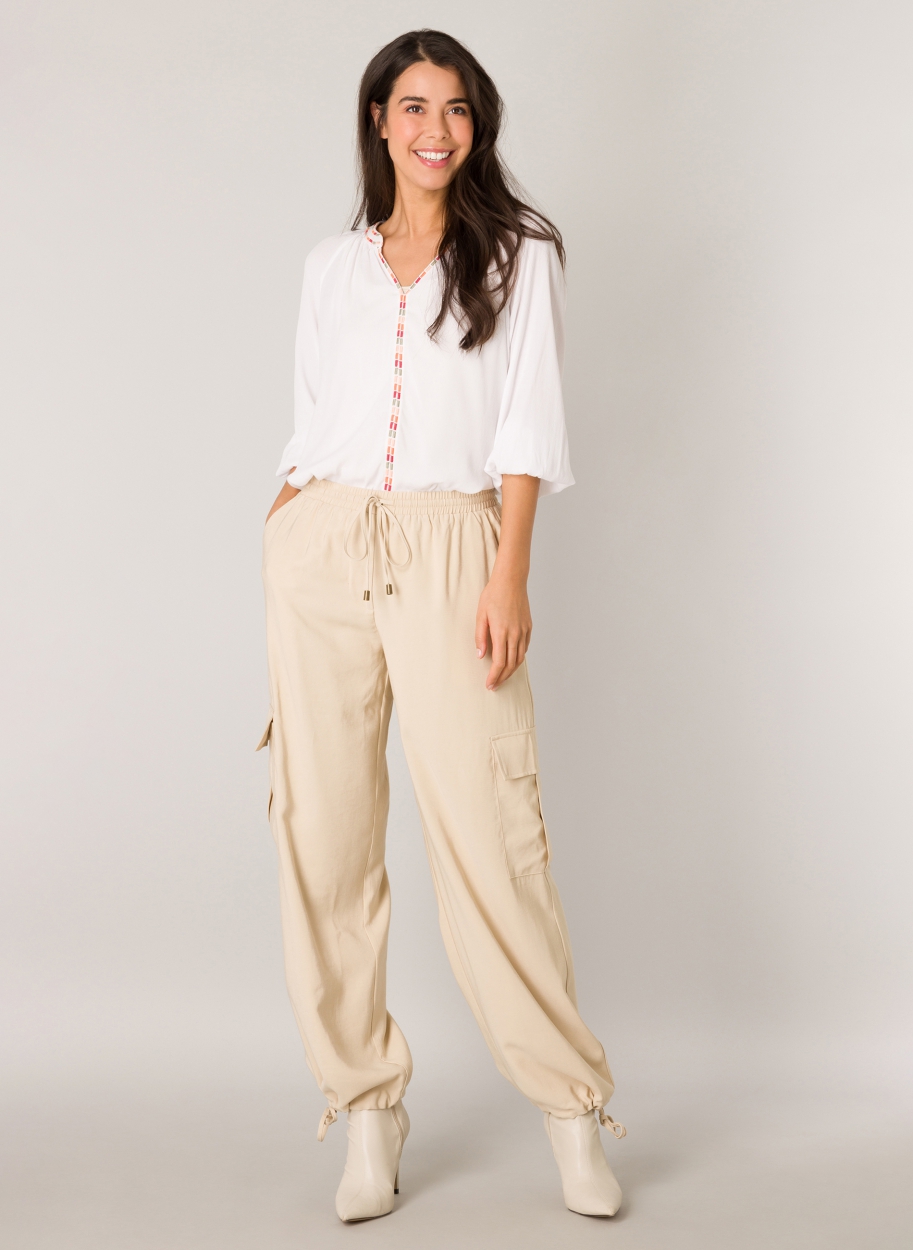 Yest 3/4 sleeve shirt has a round collar with a notched V-neck and a straight hemline. Sleeves have an elastic cuff and the blouse is made of a rayon blend. Lightweight slightly textured fabric. Shirt has embroidery of peach, sage and orange and red along collar and down front. Machine washable.
