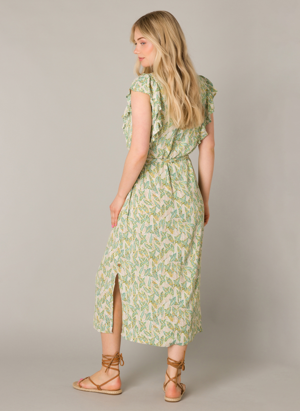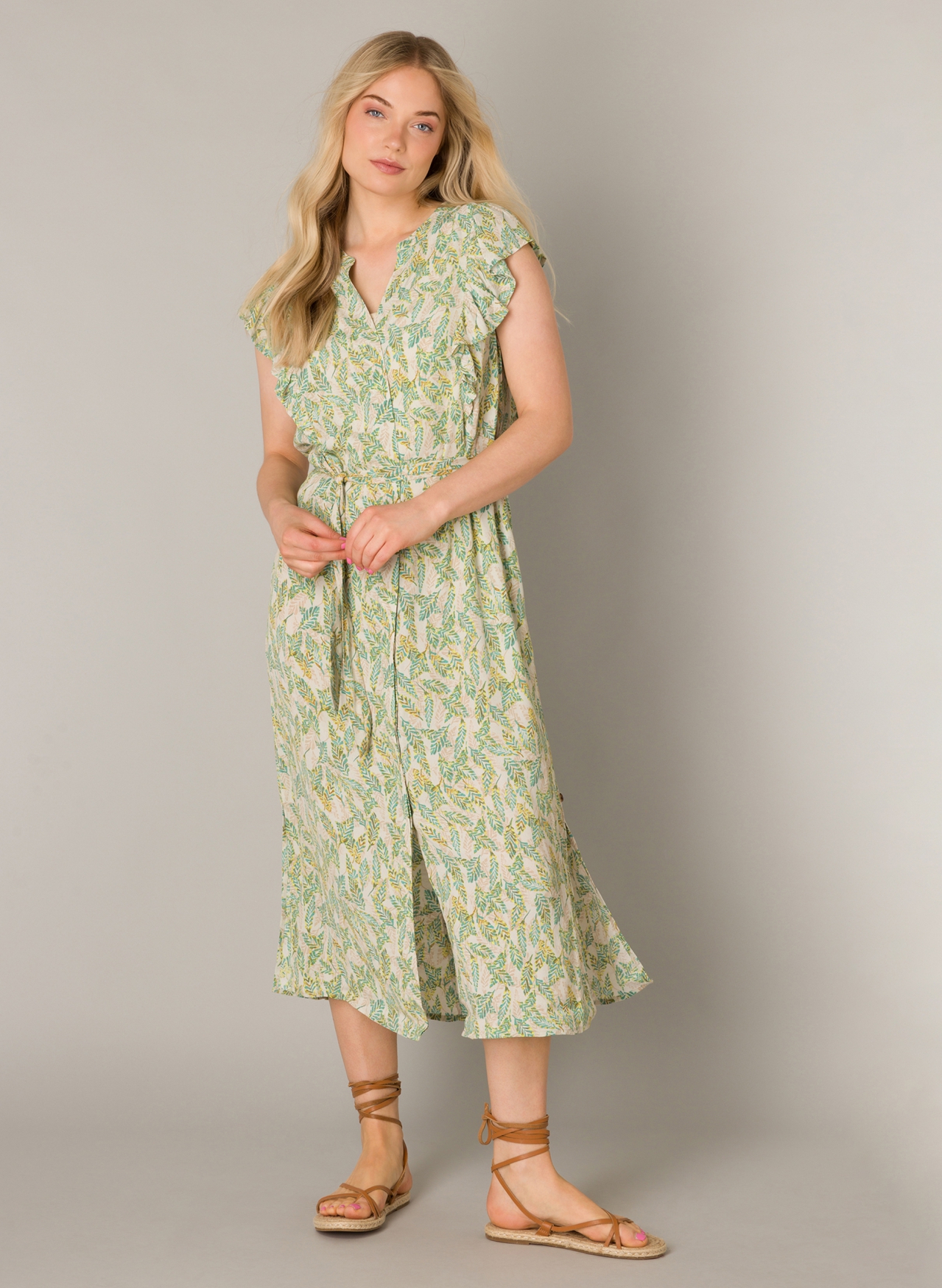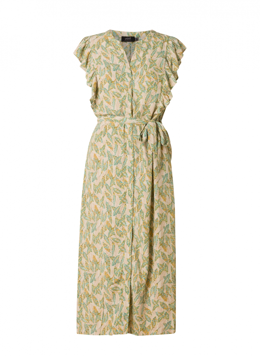 Yest dress is made of a lightweight viscose fabric with a pebble texture and all over soft leaf print. Dress has a mandarin collar with a notched V neckline, buttons down the front and has cap sleeves with a Ruffle treatment. Dress is long in length, with two side pockets and matching fabric belt. Machine washable.