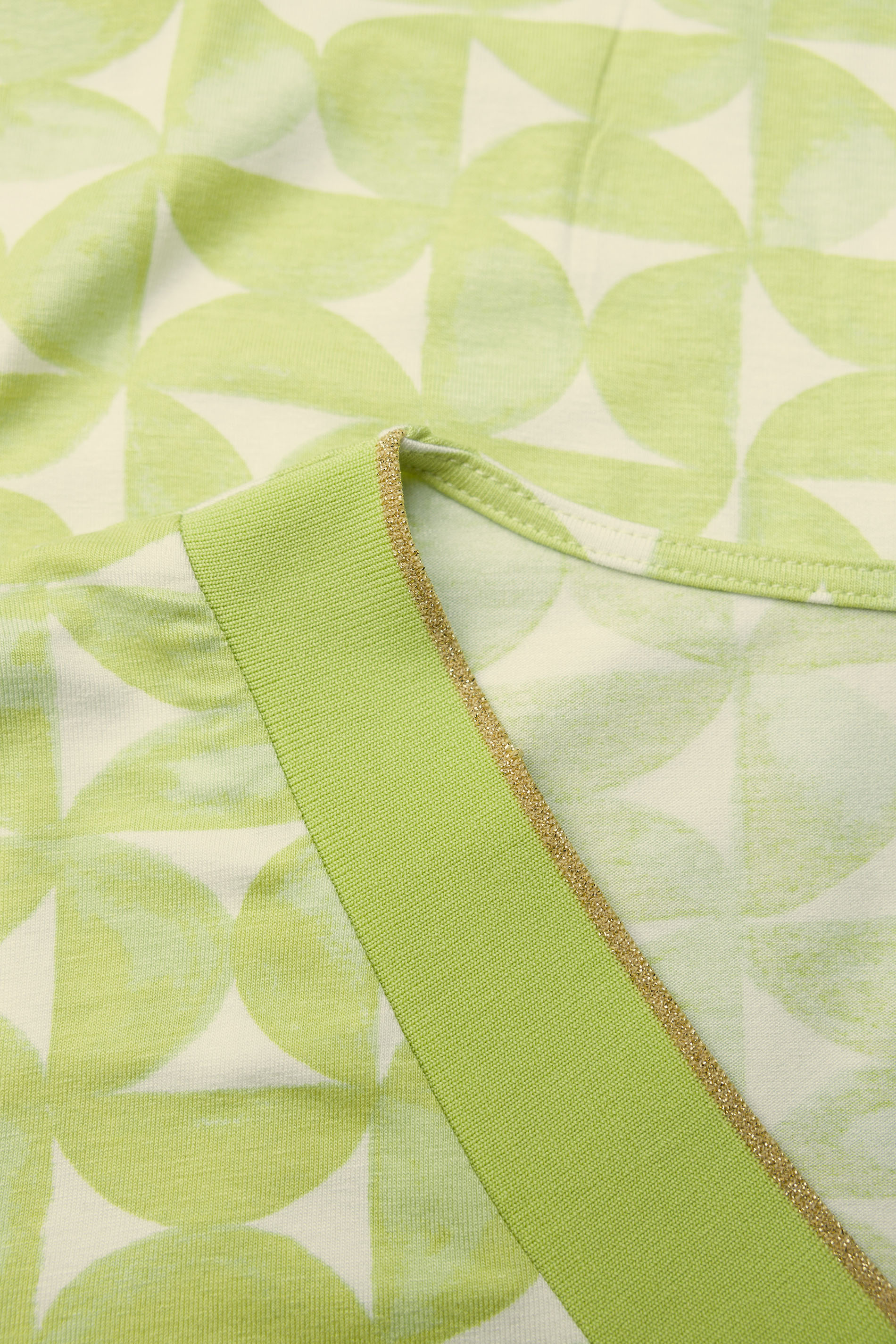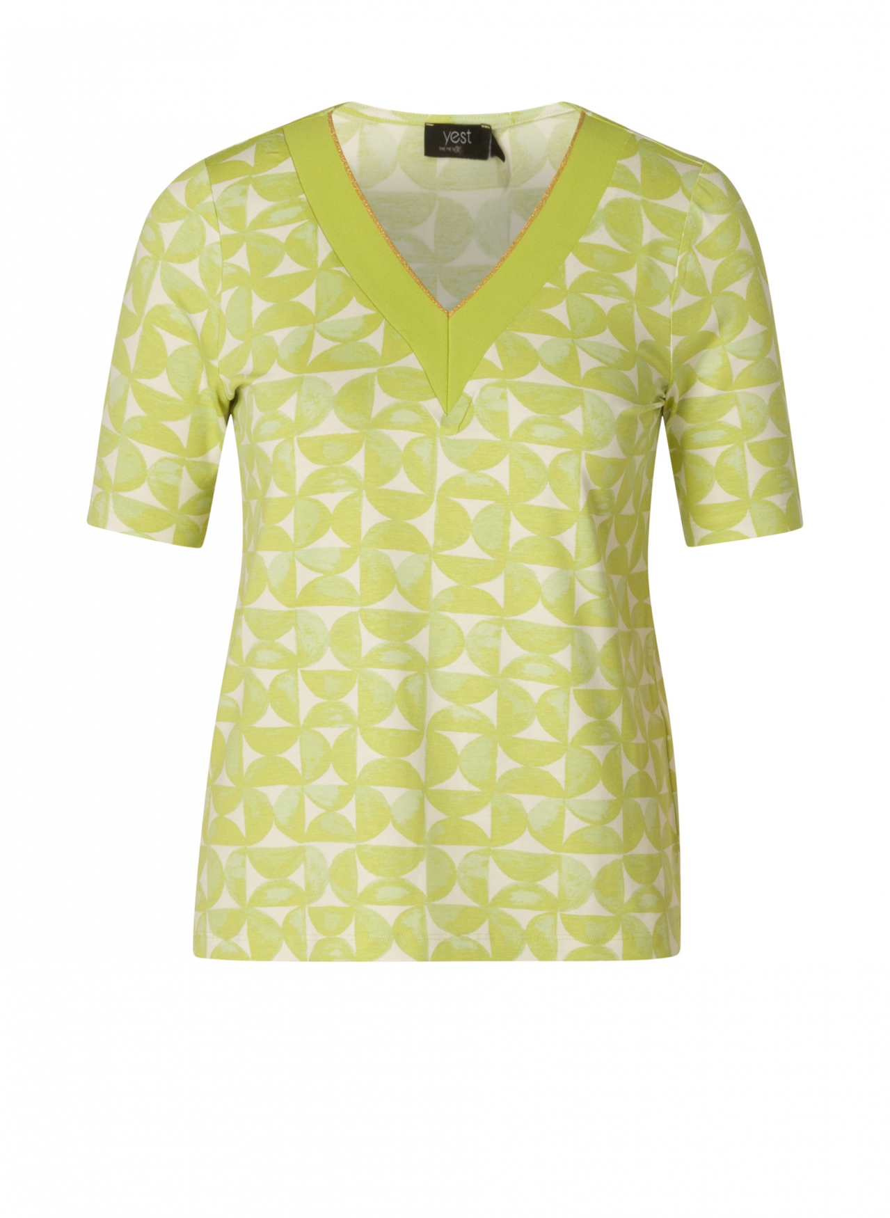 Yest short sleeve top is made of a super soft rayon based knit fabric. Tee shirt has a V neckline with a gold metallic edge, short sleeves in a fun geometric print in lime and white. Machine washable.