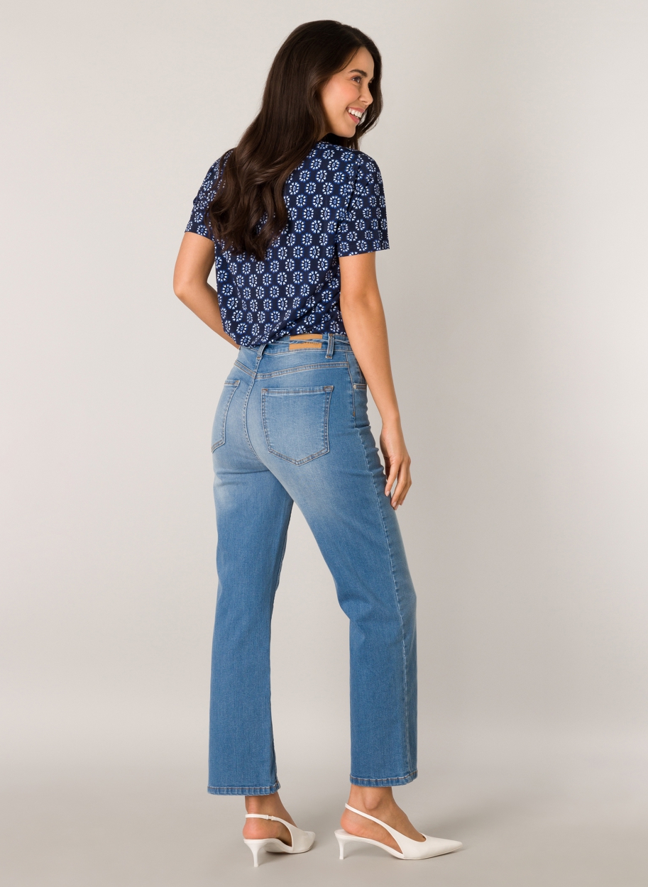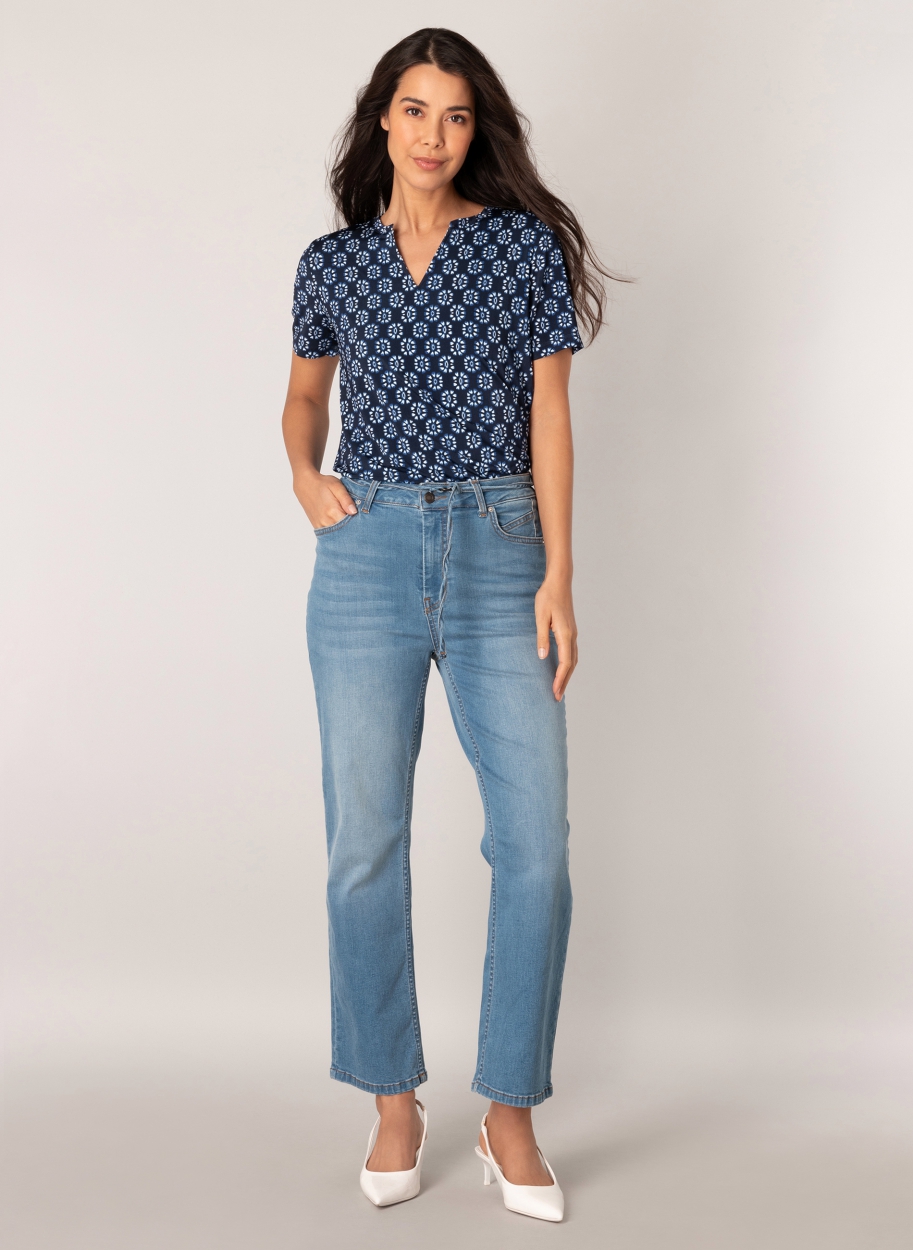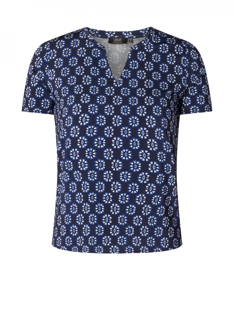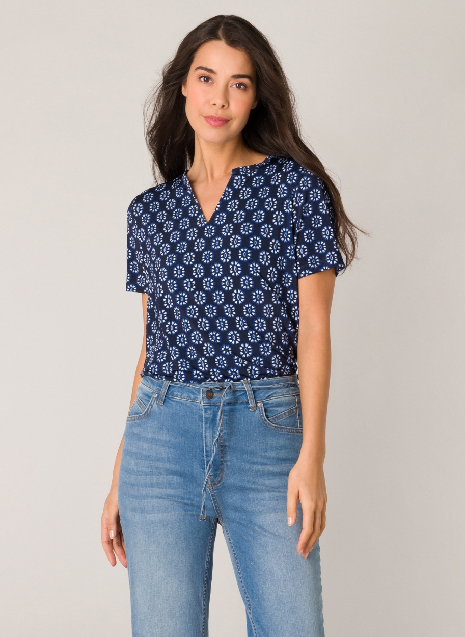 Yest short sleeve top is made of a super soft viscose blendknit fabric. Pullover top has a crew neck with a notched V shape, short sleeves in a fun geometric print in shades of blue white and navy. Machine washable.