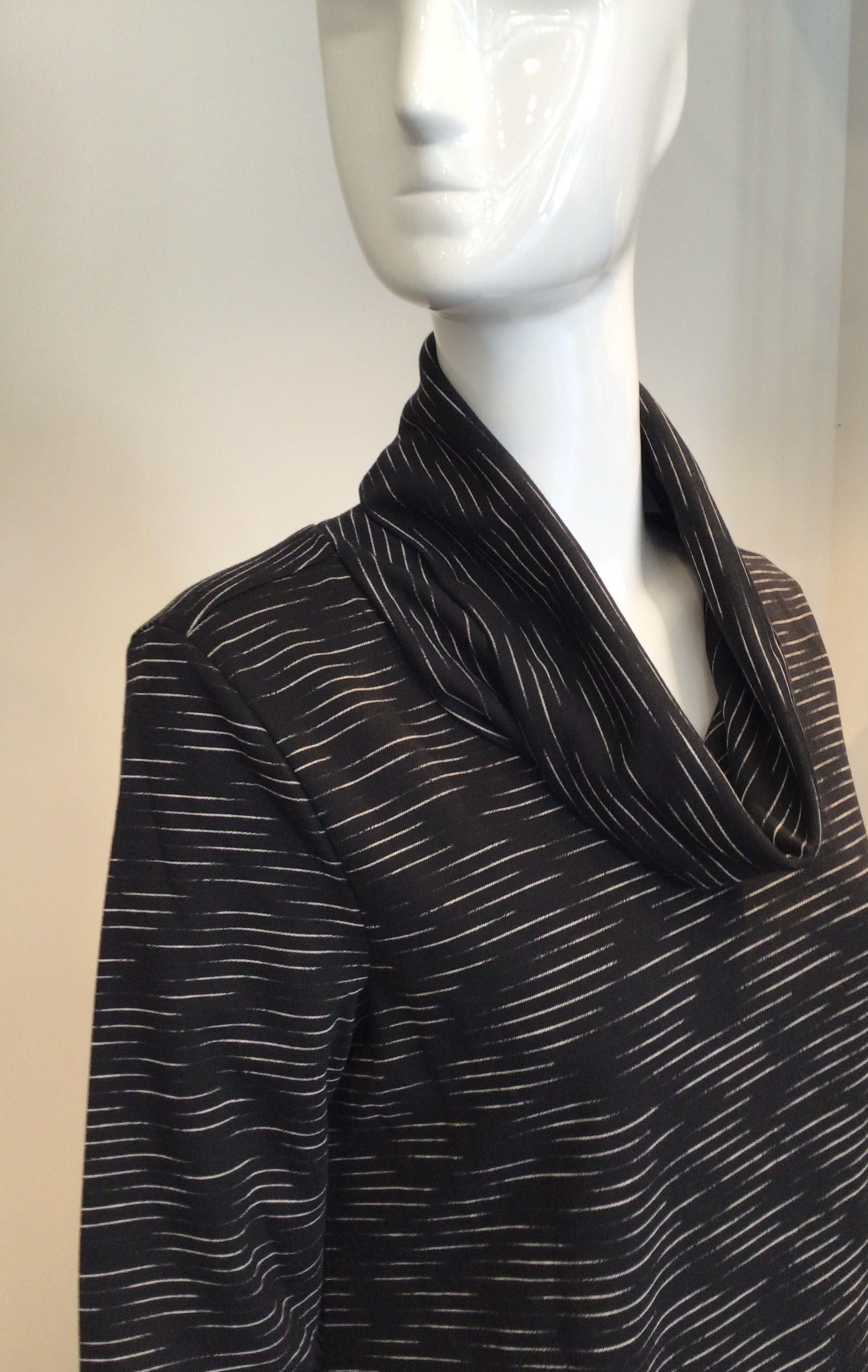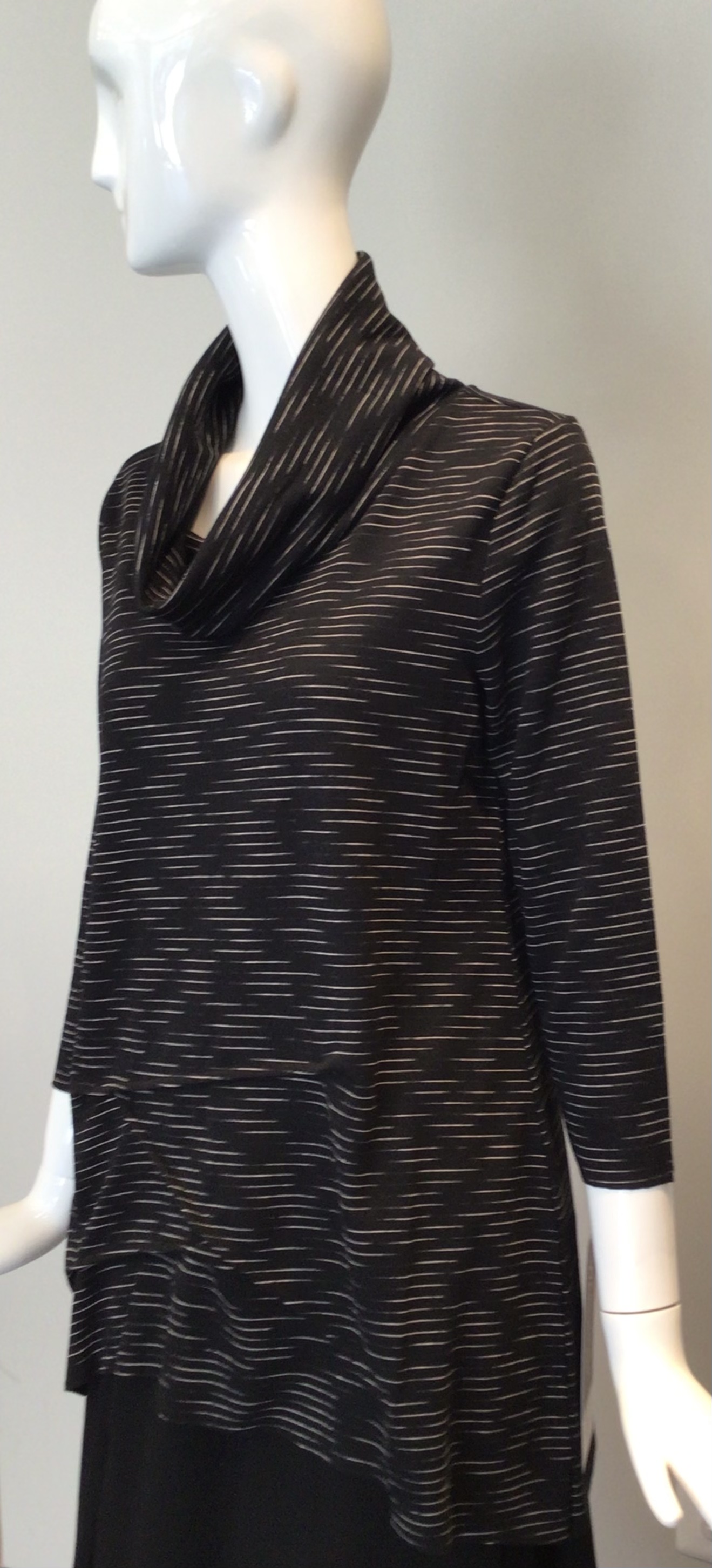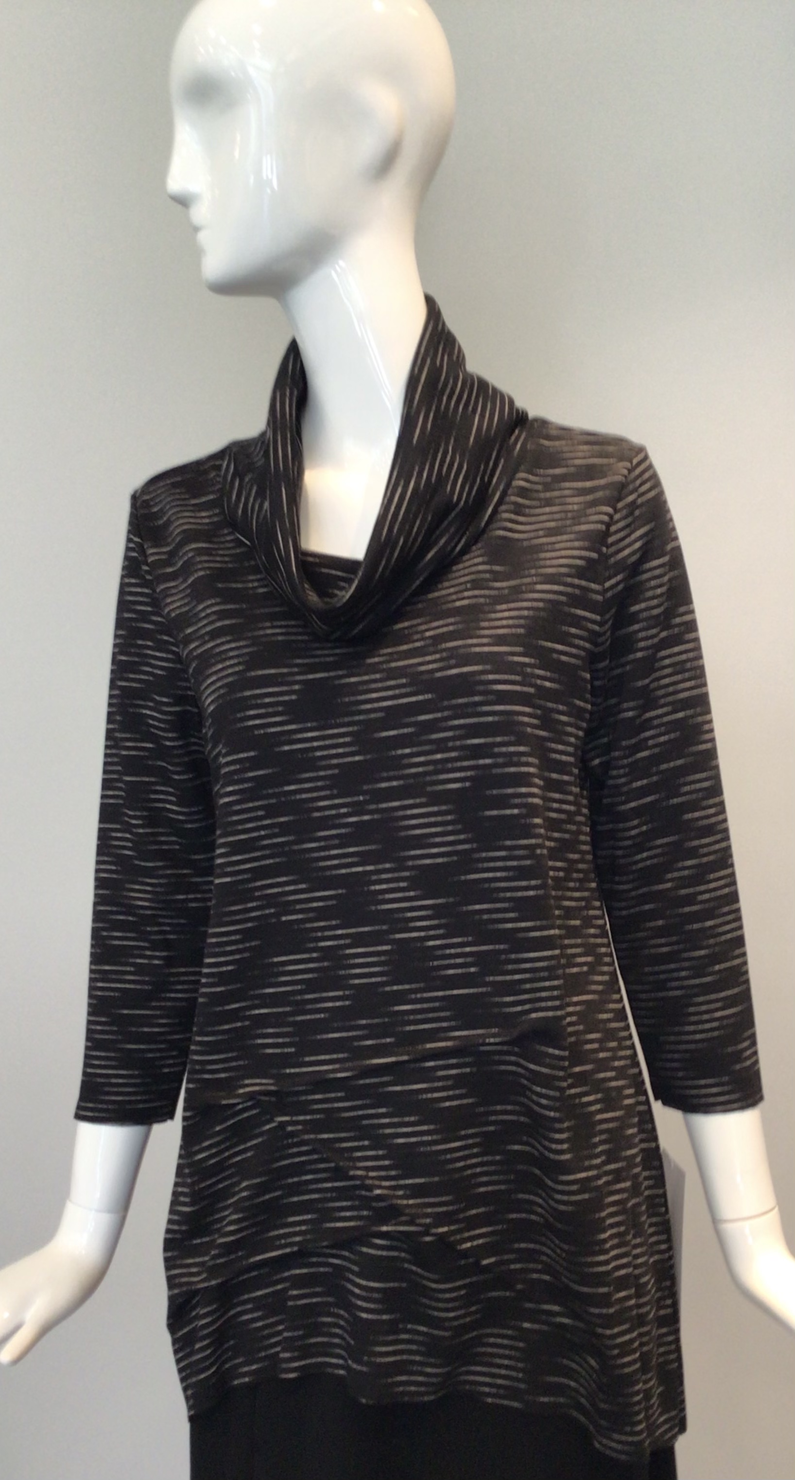 Kozan pullover top with tons of details. Soft knit fabric has a in and out linear design. Top has a cowlneck, with long sleeves and a gathered area that creates an uneven hemline. Made of a soft knit that can be worn everyday.. So much fun.
