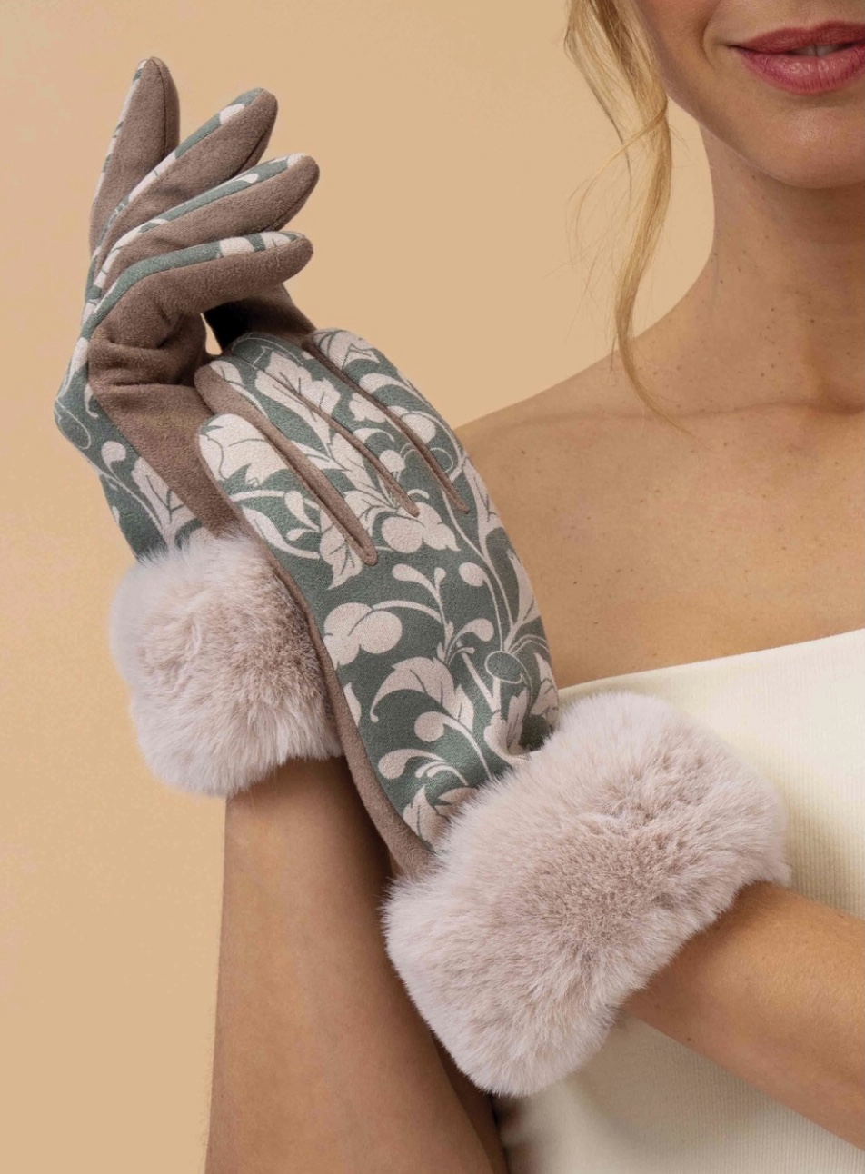 Powder UK is known for their intricate patterns, and luxurious fabrics. Beautifully crafted faux suede gloves in a floral pattern of Olive and natural on one side and the other side tan, with a natural faux fur trim. So comfy and warm, the perfect gift. One size fits all.