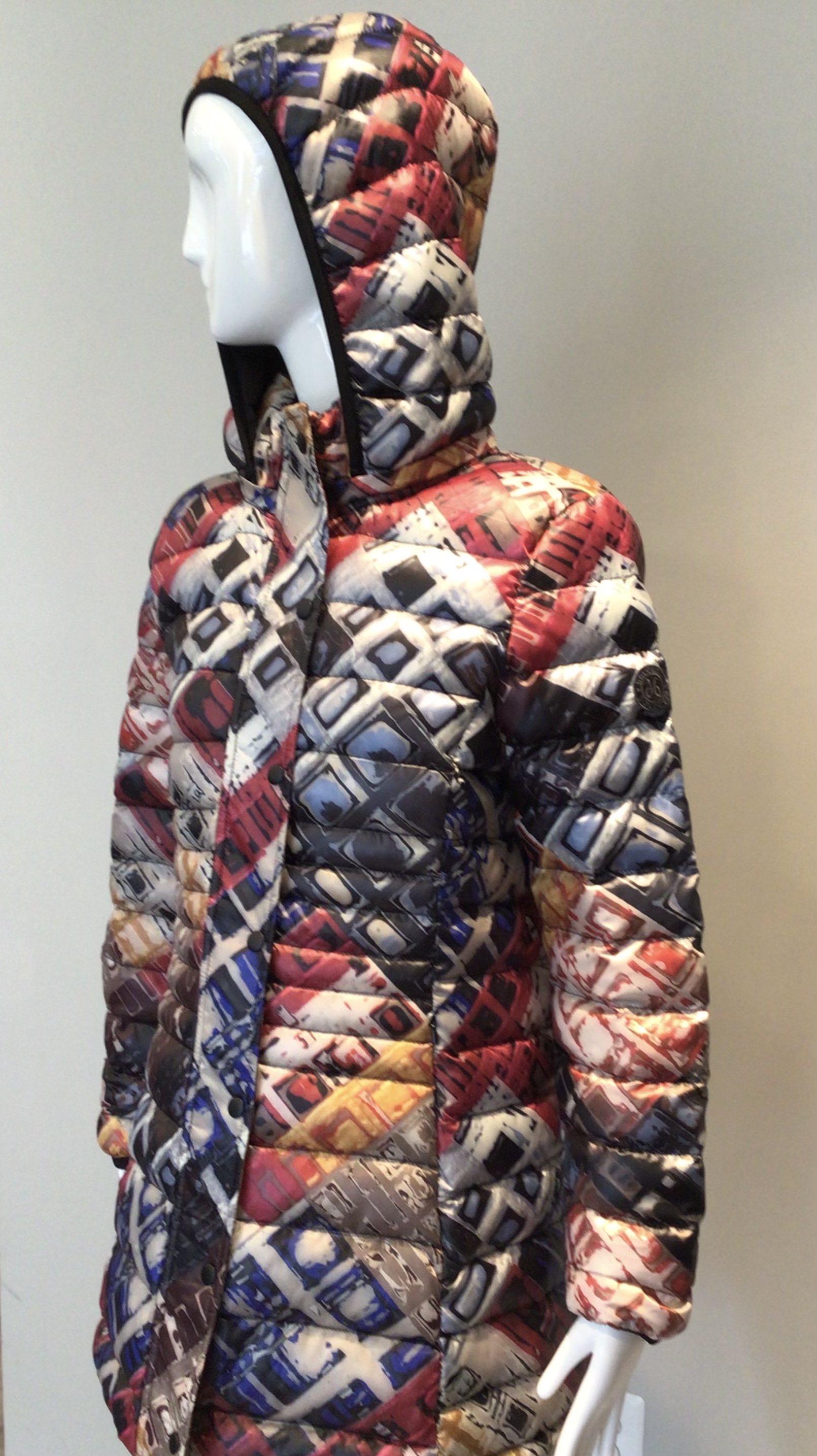 Canadian designer Dolcezza creates fabric from renown artists’ paintings. Each piece of clothing comes with a photo of original painting and a biography of the artist. This quilted coat features a stand up collar with an attached hood, zips up the front with two hidden zipper pockets in a close to the body fit. Jacket is longer in length to keep you warm this winter.