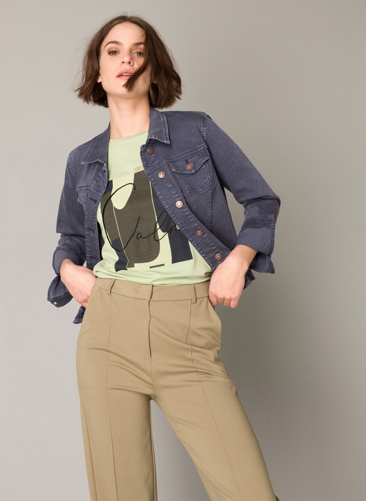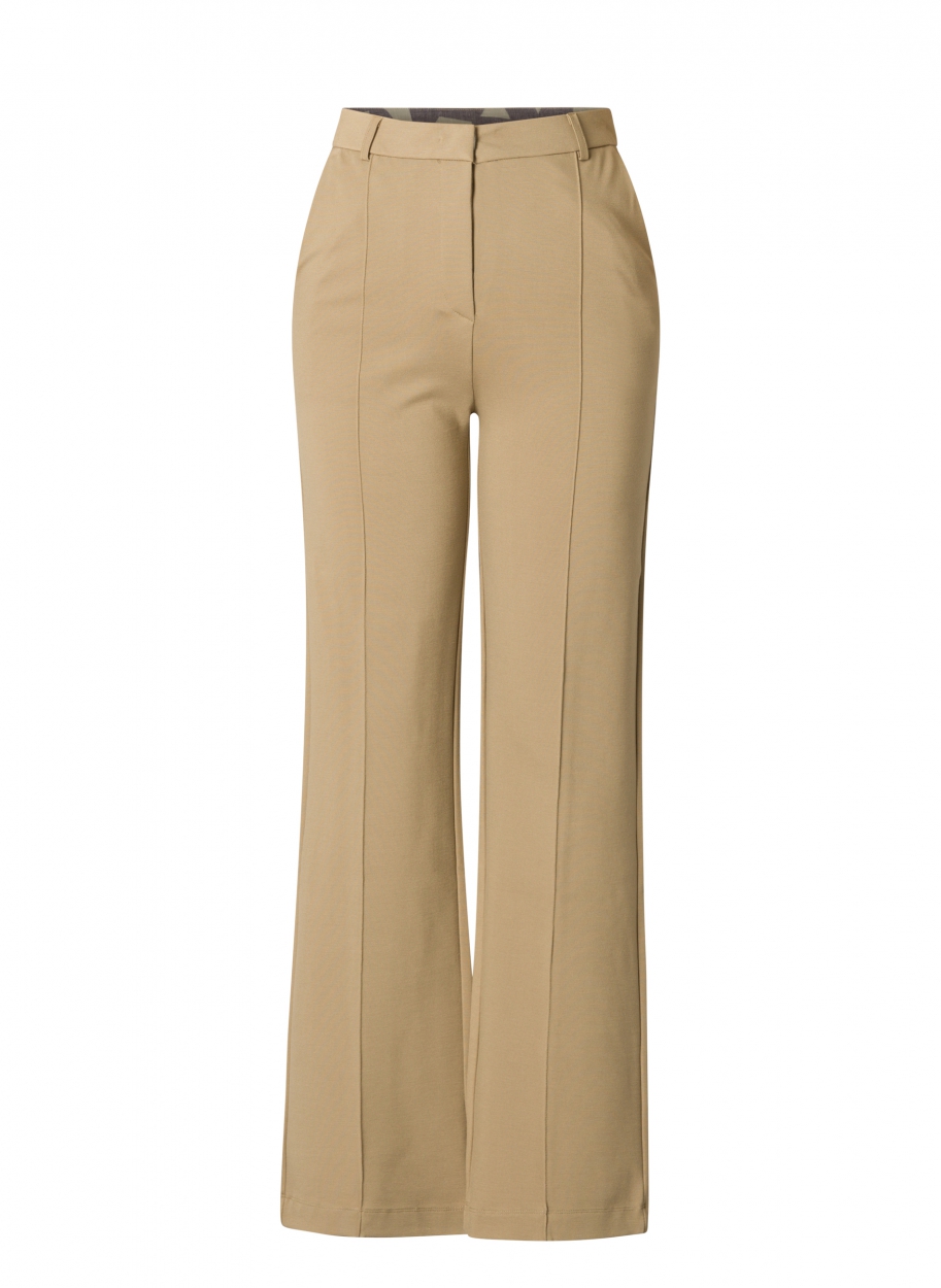 Yest knit pants have a waistband and zipper with a straight leg and made of a sturdy knit fabric in khaki green. Comfy fitting pants with two side pockets And seams down the center of each leg.
