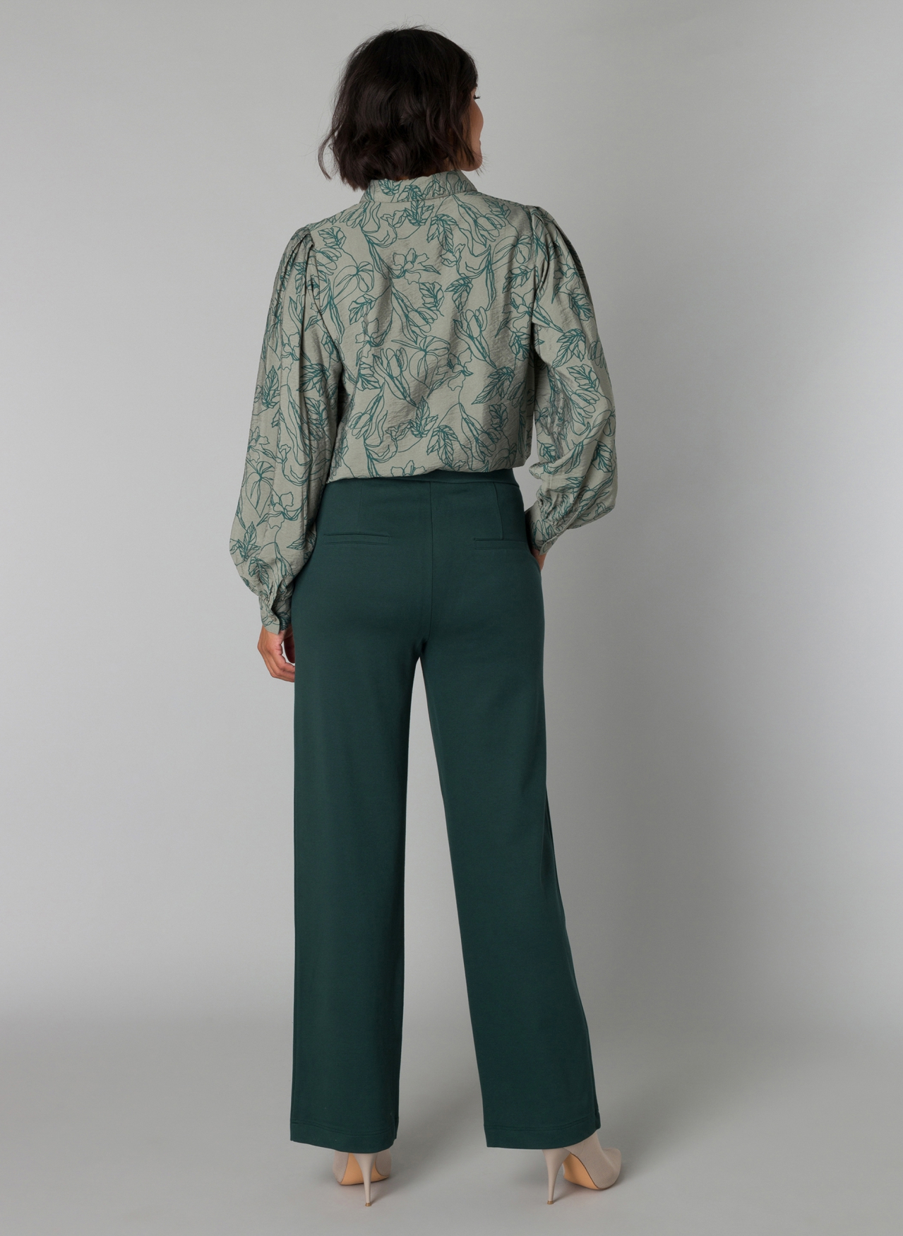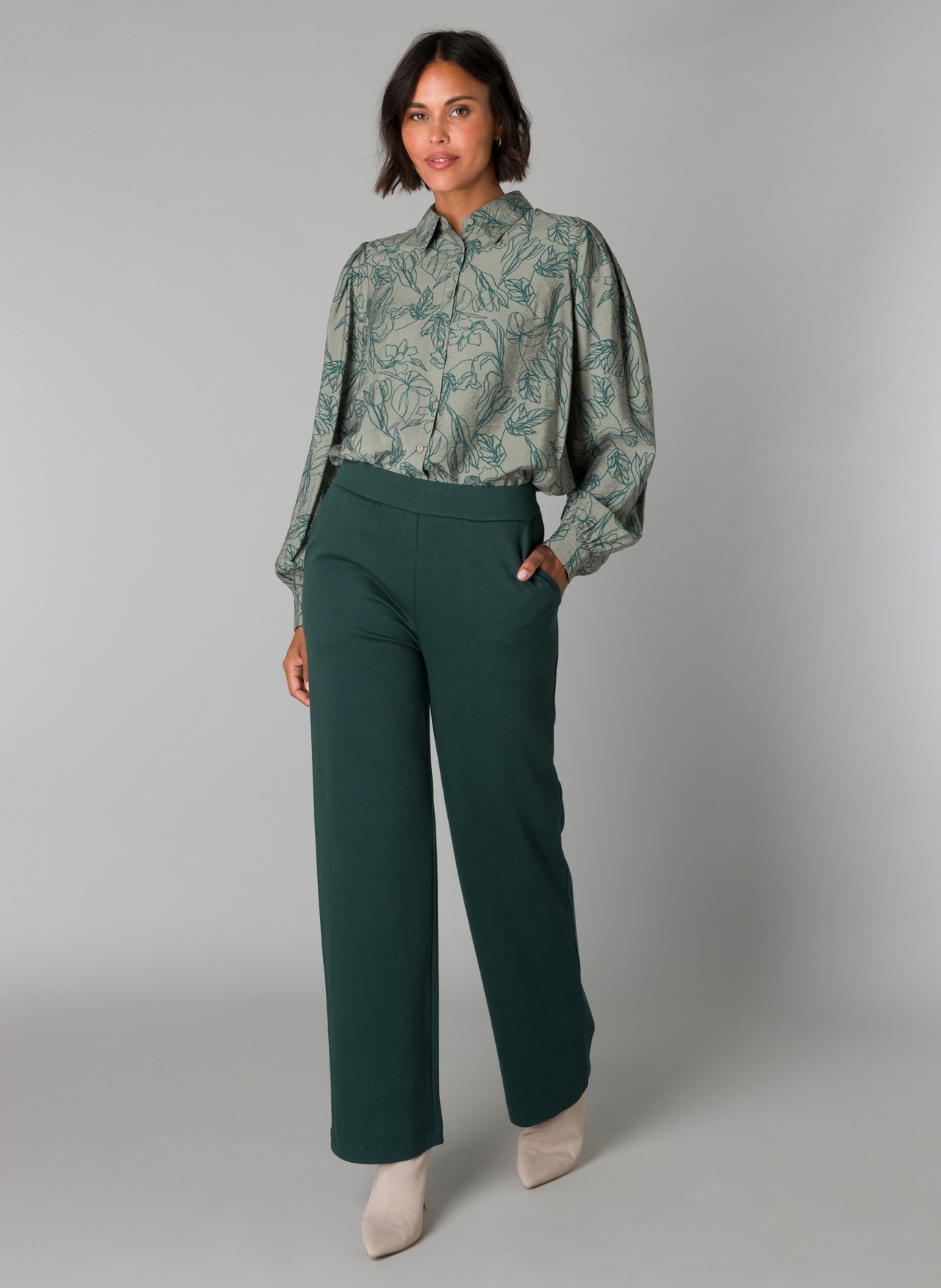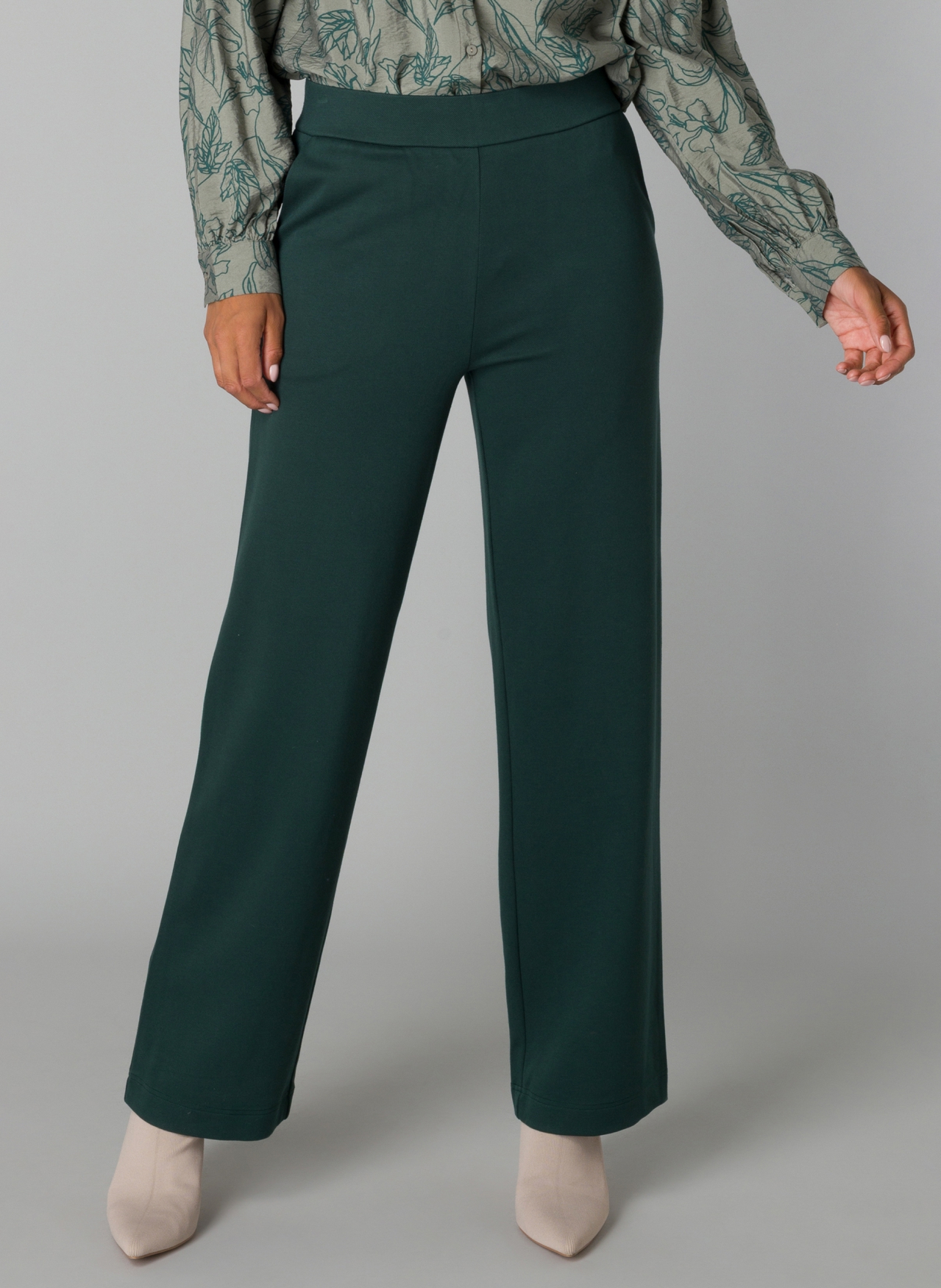 Yest knit pants have an elastic waistband, wide leg and made of a sturdy knit fabric in hunter green. Comfy fitting pants with two side pockets. Add the matching hunter green Boucle jacket for a complete look.