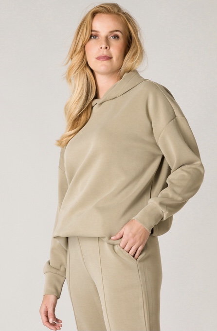 Yest casual pullover top is made of a thick super soft fabric that feels like bamboo. Top has a funnel neckline with a short zipper, long sleeves and band at waistline with a slightly loose fit. So comfy but have a juxurious feel. Machine washable.
